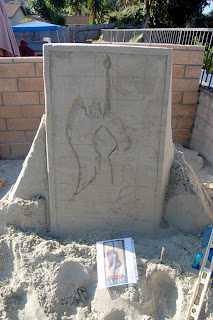 As you can see from the photos of this recent sand sculpture we did, we use a life-size sketch of the design to ensure we have the right proportions before we begin sculpting. We also use a grid pattern to help us translate the design to the sand perfectly.